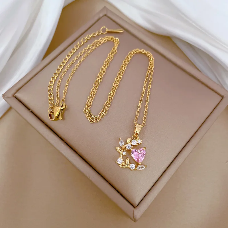 Stainless Steel Chain Pink Zircon Love Heart Leaf Pendant Necklace for Women Girls Romantic Sweet Jewelry Accessories Gifts